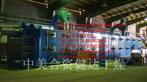 新鮮(xiān)水果是人們不可缺少的營養品。然而水果易腐爛,不易長期貯存(cún)是一個不容忽視的實際問題,針對這一問題我公司在原有帶(dài)式幹燥機的基礎上進行(háng)了技(jì)術改進(jìn),改進後的帶式幹燥機使用串聯(lián),形成(chéng)初幹段、中間段(duàn)及終幹段。在初幹(gàn)段中,由(yóu)於物料含水量高,透氣性(xìng)差,故采用薄的鋪料厚度,較快的運行速度及較高的幹燥溫度。如(rú)對物料溫度不允許超(chāo)過60℃的物料,初幹段(duàn)中,幹燥氣體溫度可(kě)高過120℃以下;終幹段內物料停留時間是初幹段的3-6倍,鋪料厚度是初幹段的2-4倍,對於物料溫度(dù)不超過(guò)60℃的要求,可采用80℃的(de)左右(yòu)的幹燥氣體(tǐ)。采用多段組(zǔ)合帶式幹燥機,可更好地發揮帶式的幹燥性(xìng)能,使幹燥更加均勻。
