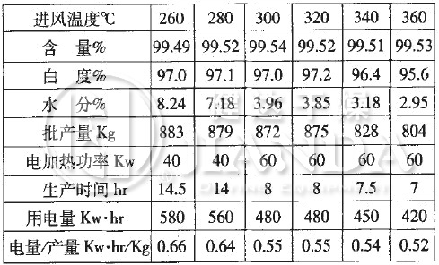 我(wǒ)們進行(háng)了分組(zǔ)試驗,取相同的樣本(běn)量,不同的(de)進風(fēng)溫度進行試驗。其中進風溫度分布為(wéi):260℃、280℃、300℃、320℃、340℃、以及360℃。樣本(běn)的含水(shuǐ)量14.05%,白度為96%。出風溫度設定為95-105℃。