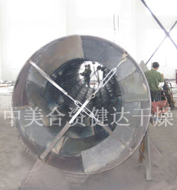濕(shī)物料加入HG回轉滾筒幹燥機(jī)後,在筒內(nèi)均布的抄板器翻動下,物料在幹燥機內均勻分布與(yǔ)分散,並與並流(逆流)的熱空氣充分接觸,加快了幹燥(zào)傳(chuán)熱。傳質。在幹(gàn)燥過程中,物料在帶(dài)有傾斜的抄板和熱氣流的作用下,可調控地運動至於幹燥機另一段星型卸料(liào)閥排出成品。