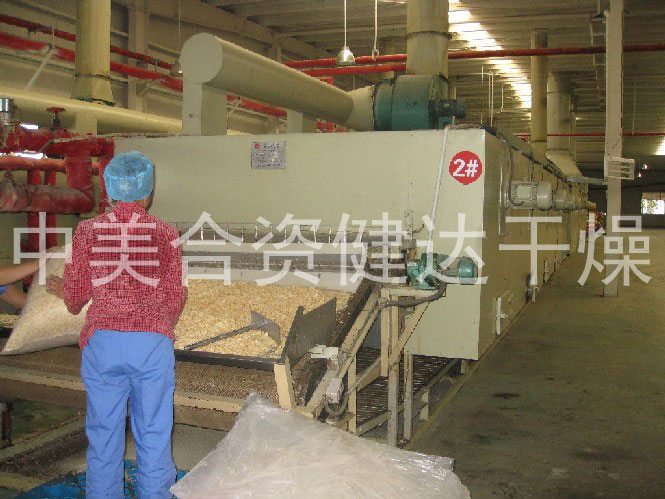 鮮料從車間的左側進入室內,經選料、初洗(xǐ)、去皮、複洗、切分、漂燙、冷激、甩幹後裝機,再經2條帶式幹燥生產線進行幹燥,幹燥後產品(pǐn)由(yóu)幹燥機尾端卸料並經輸送器送入包裝室,在該(gāi)室經冷卻、精選、裝袋、計量、封口、打包(bāo)後產品由車間右門出廠。